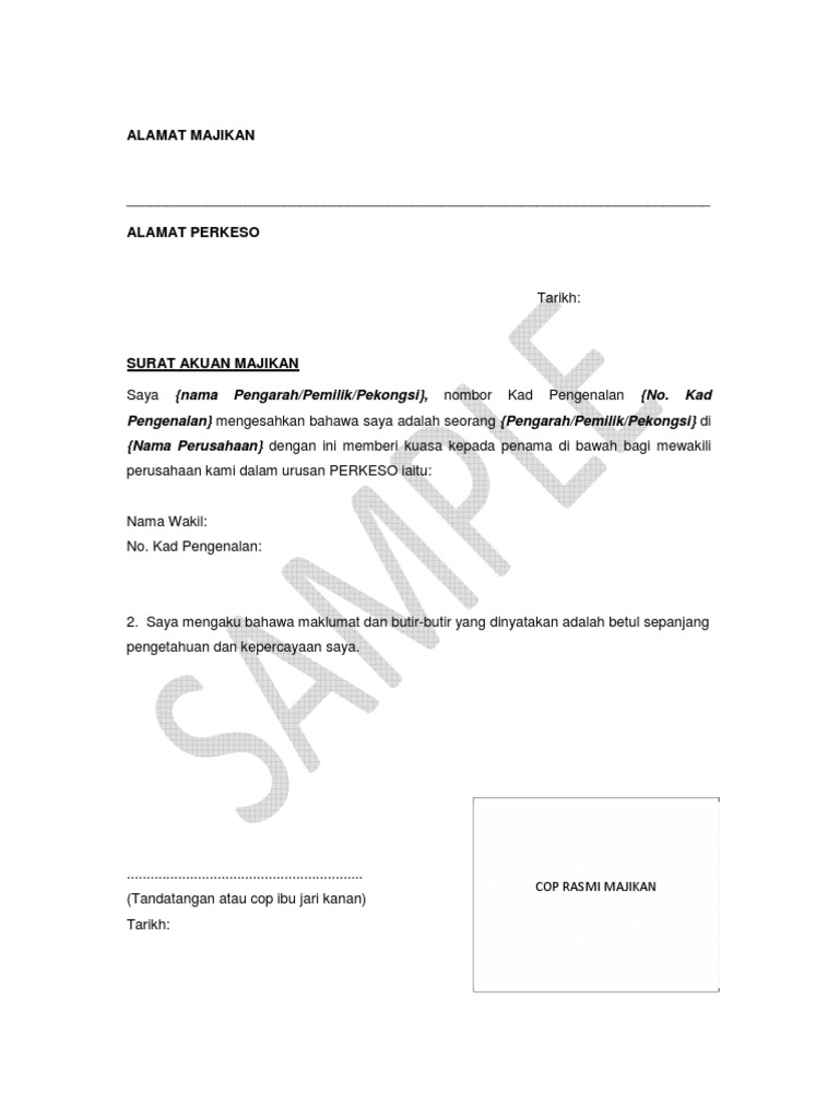 SILA GUNAKAN LETTER HEAD MAJIKAN. Contoh Surat Pengesahan Majikan swasta atau kerajaan Untuk Jawatan Pekerja atau contoh surat confirmation letter untuk tahun 2021 ini. Mengesahkan bahawa saya adalah seorang Pengarah di syarikat saya dengan ini memberi kuasa kepada penama di bawah bagi mewakili perusahaan kami dalam urusan PERKESO iaitu.